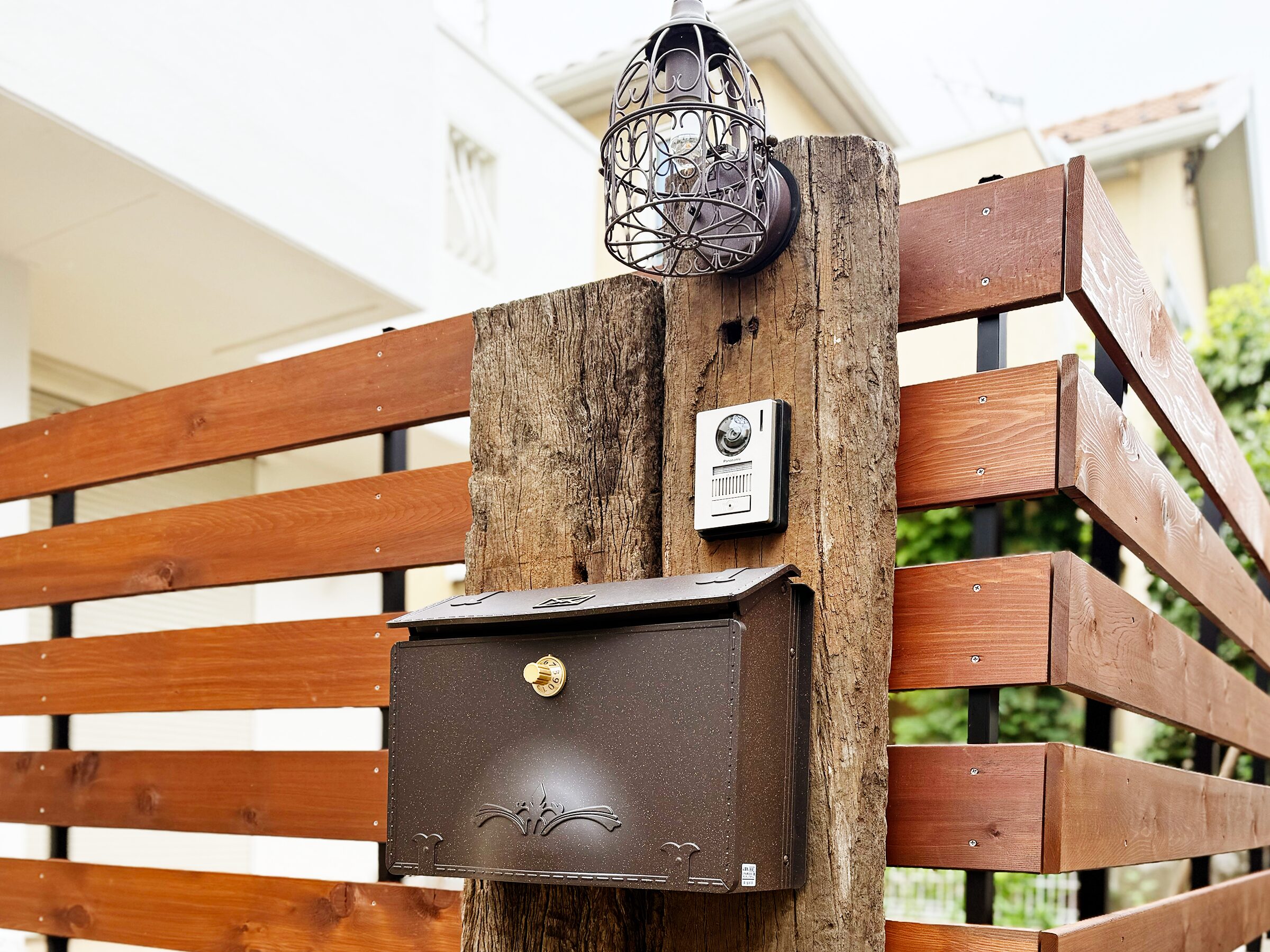 お施主様の一番のこだわりは外装の色味と新しく設置したお庭。お庭を囲む柵とインターフォンを取り付けた柱には、天然の枕木と米杉を使用致しました。天然木は定期的なメンテナンスが必要ですが、人工素材には出せない質感や経年変化を楽