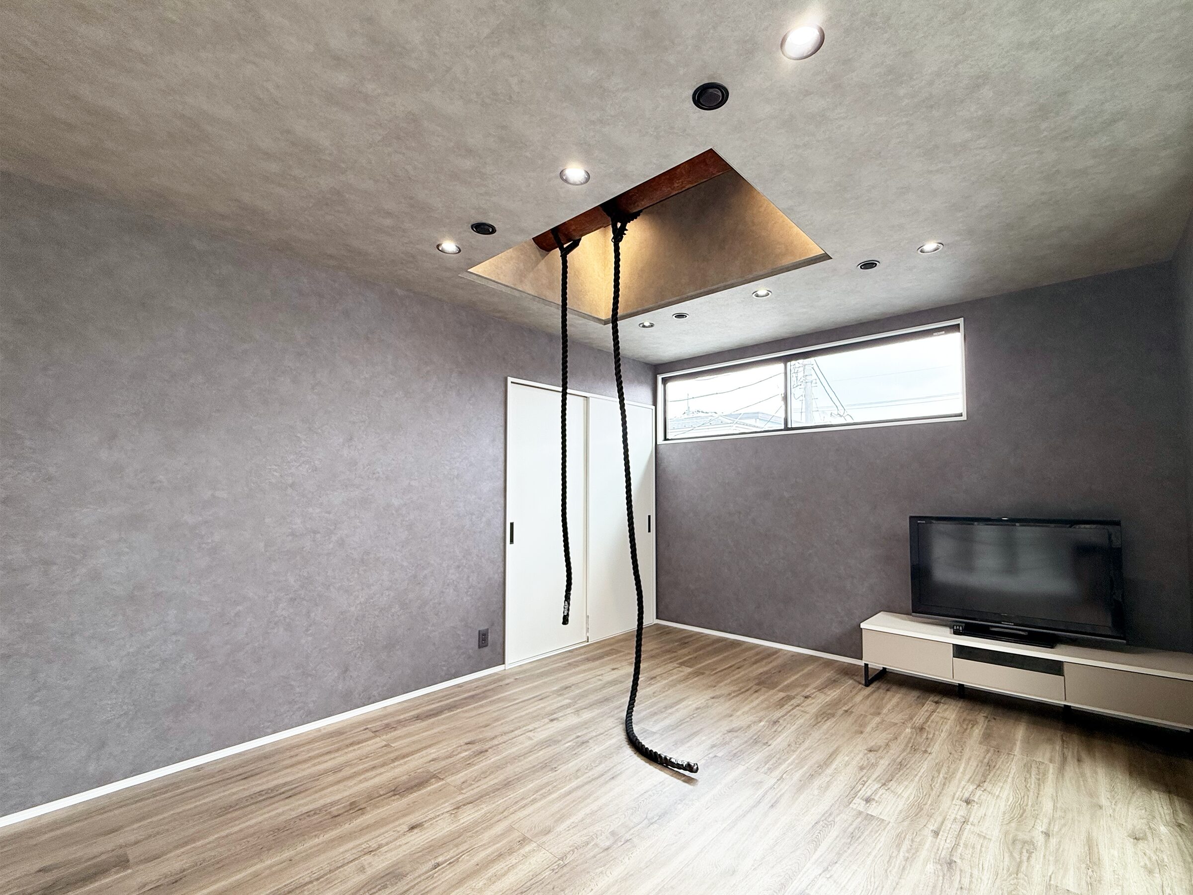 2階のフリースペースには家族皆がそれぞれにくつろげる様に既存の松梁をむき出しにしみせる梁へ~筋トレに使用する縄を取り付けました。